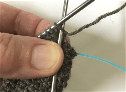Now I’ll knit into those stitches on the front needle. Because the yarn is at the front, and not being carried around from the back, there will be a slight gap at the beginning of this round. It will be hidden later by the outside cuff.